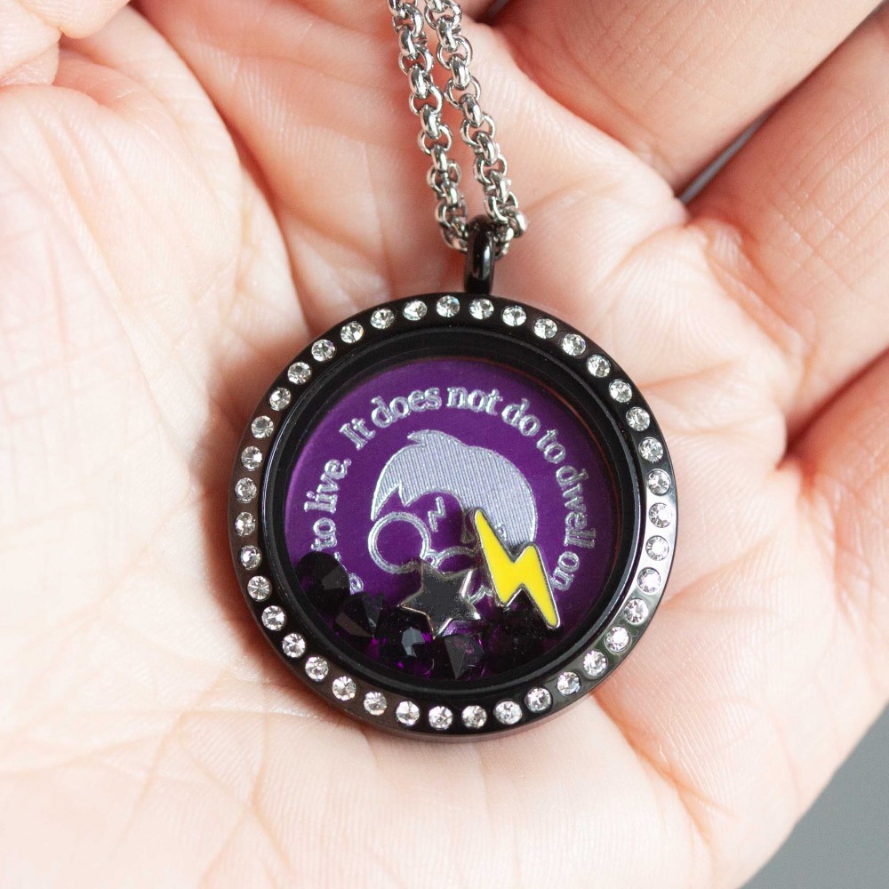 This theme locket comes with the plate engraves with "It does not do to dwell on dreams and forget to live'', as well as the hair and glasses clipart in the middfle of the plate.