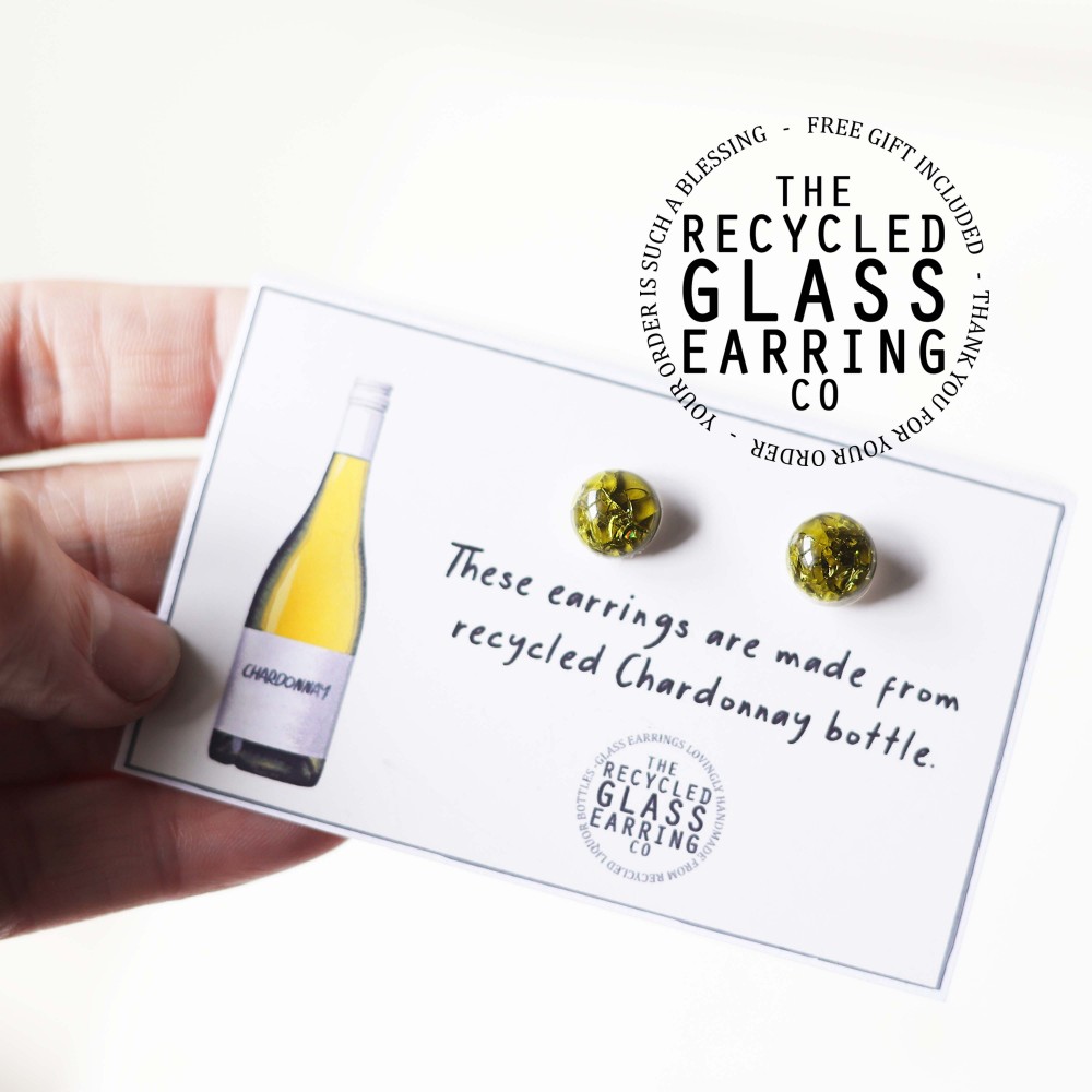 These earrings are lovingly handmade from recycled Chardonnay bottle.