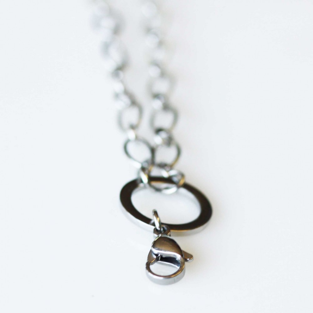 Long length cable necklace in silver tone.